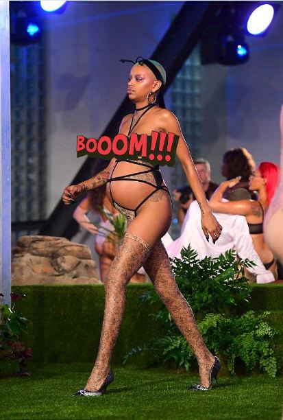 واختتمت ريهانا عرضها بطريقة استثنائية وجريئة للغاية، إذ استعانت بالوجه الإعلامي لعلامتها التّجارية، وهي عارضة الأزياء "سليك وودز"، والتي كانت تودّع اللحظات الأخيرة من حملها خلال عرض الأزياء.