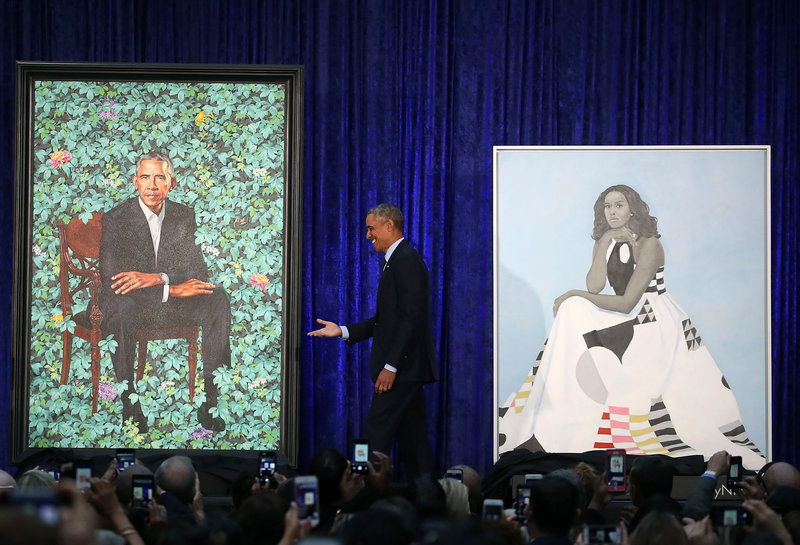 كَشف معرض سميثسونيان للصور الوطنية النقّاب عن صورتي ميشيل وباراك أوباما العملاقتين يوم أمس الإثنين، ولأوّل مرة في تاريخ المعرض، تّم رسم صورتي الرئيس الأمريكي وزوجته سيدة أمريكا الأولى السابقين على يد رسّامين من ذوي البشرة السوداء، وهما كيهيند وايلي وإيمي شيرلاد.