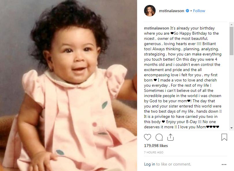واستطردت تينا تعليقها "في الكثير من الأحيان، لا أصدّق أنّ الله اختارني من بين العديد من النّاس الرائعين في هذا العالم لكي أكون أمّك، فيومي ولادتك أنتِ وشقيقتك، كانا أسعد يومين في حياتي، وإنه لشرفٌ لي أنني حملت بكما في جسدي، فلا أحد يستحق أكثر من ذلك".
