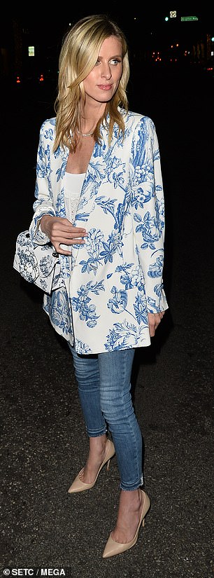 وافتتحت ابنتها نيكي الحفلة، ببليزر أبيض متوسط الطول، يغطي بلوزة بيضاء شفافة، منقوش بورد أزرق وجينز ضيق، إذ كانت من أول الأشخاص الذين التقطت لهم الصور، ونسقت معهم حذاء بيج بكعب عالٍ وحقيبة يد مطابقة للبليزر لوناً ونقشاً.
