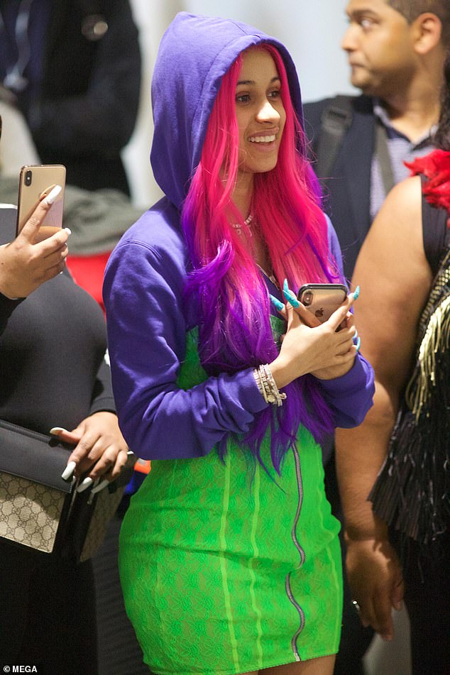 وعلى صعيد إطلالتها، ارتدت كاردي بي فُستانًا قصيرًا جاء باللونين الأخضر والبنفسجي، كما غطّت شعرها بباروكة لونها وردي وبنفسجي، في حين تخلّت عن وضع مساحيق التّجميل.