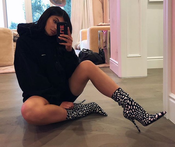 تظهر "كايلي جينر" (20 عامًا) جاسةً على الأرض مرتدية "هوديز" أسود ونسقته بهوت شورت قصير أسود، وأكملت إطلالتها بحذاء ذو كعب عالٍ بطبعات باللونين الأسود والأبيض، وعلقت: "عيد الحب"، لكن لا وجود للون الأحمر في الصورة.