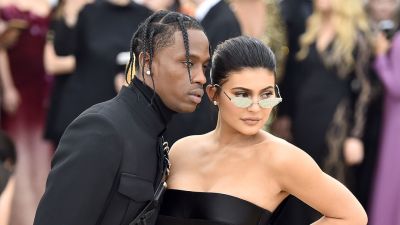 وفي صورة أخرى، تعانق كايلي حبيبها مرتديةً فستان قصير أبيض اللون من تصميم أليكساندر وانغ نسَّقته مع جوارب طويلة بيضاء، في حين أمسك "ترافيس" بقدمها.