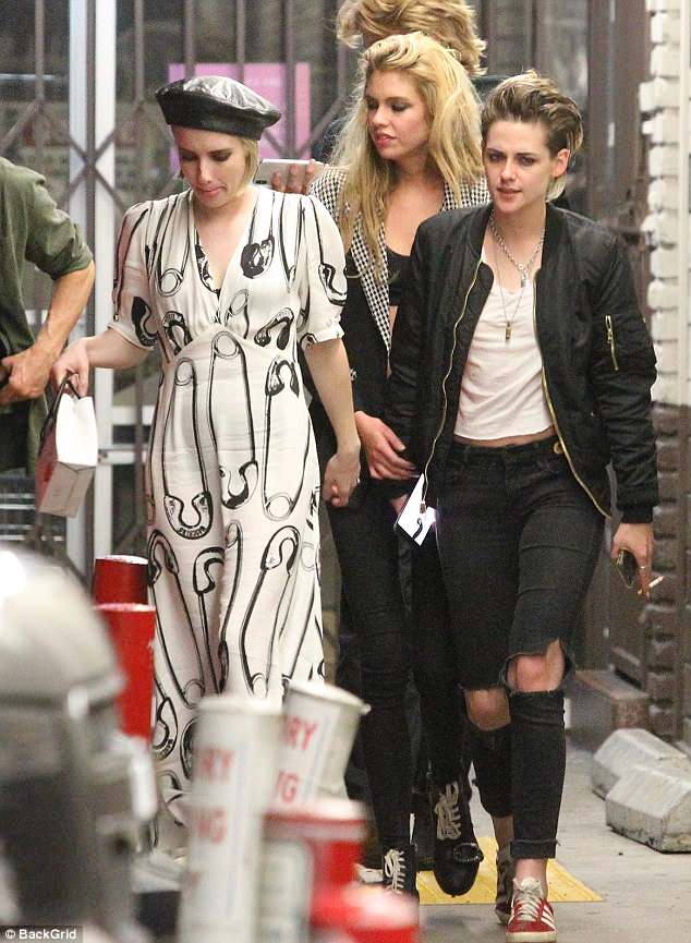 وفي إحدى الصور، تتودد "كريستين" كما يبدو إلى الممثلة "إيما روبرتس" التي ارتدت فستان طويل أبيض بطبعات على شكل دبابيش سوداء، وأكملت إطلالتها معتمرةً قبعة سوداء جلدية.