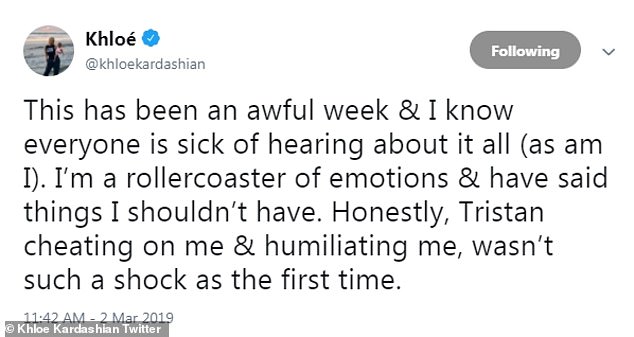 وأوضحت في تغريدتها أنها كانت تمر بأسبوع صعب وأليم، وأنها عن غير قصد تفوَّهت بكلام لم يجدر بها قوله، واستطردت: "في الحقيقة، تريستان خانني وأهانني، ولم يكن الأمر بمثابة صدمة لي كما في المرة الأولى."