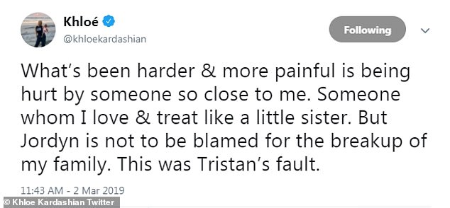 تراجعت "كلوي كارداشيان" عن كلامها الذي نشرته عبر حسابها على موقع "تويتر"، حينما أشارت إلى أن "جوردن وودز" السبب في دمار وتفكيك عائلتها بعد إقدامها على خيانتها مع حبيبها ووالد طفلتها "تريستان تومسون"، لتنشر بعدها تغريدة تؤكِّد أن صديقتها الخائنة ليس لها علاقة بما يجري في عائلتها، موجِّهةً أصابع الاتهام للاعب كرة السلة "تريستان".