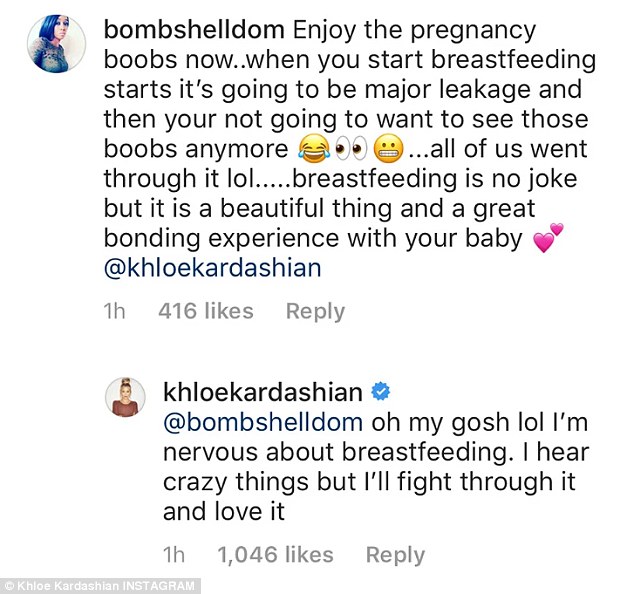 وعلى الفور، قامت "كلوي" بالرد على التعليق، وكتبت: "يا اللهي، إنني متوترة من فكرة الرضاعة الطبيعية، فقد سمعت الكثير من الامور الجنونية حول الموضوع لكنني سأحب الأمر."