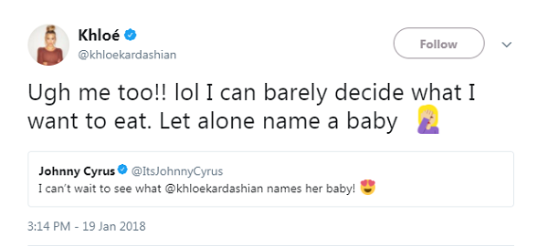 وكتب مغرد يدعى "جوني سايروس"، والذي يعرف نفسه بأنه من أكبر متابعي عائلة كارداشيان، تغريدة جاء فيها: "أتشوق لمعرفة الاسم الذي ستختاره "كلوي" لطفلها المنتظر"، لترد عليه "كلوي" بأنها لا تزال في حيرة من أمرها وأنها لم تتخذ قرارًا بعد بهذا الشأن.