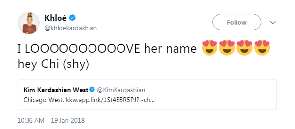 وكتب أحد متابعي "كلوي" تغريدة عبّر فيها عن شوقه لمعرفة الاسم الذي ستختاره "كلوي" خاصة بعد أن فاجئت شقيقتها الكبرى "كيم" الجميع بالاسم الذي اختارته لطفلتها الجديدة من أم بديلة "شيكاغو".