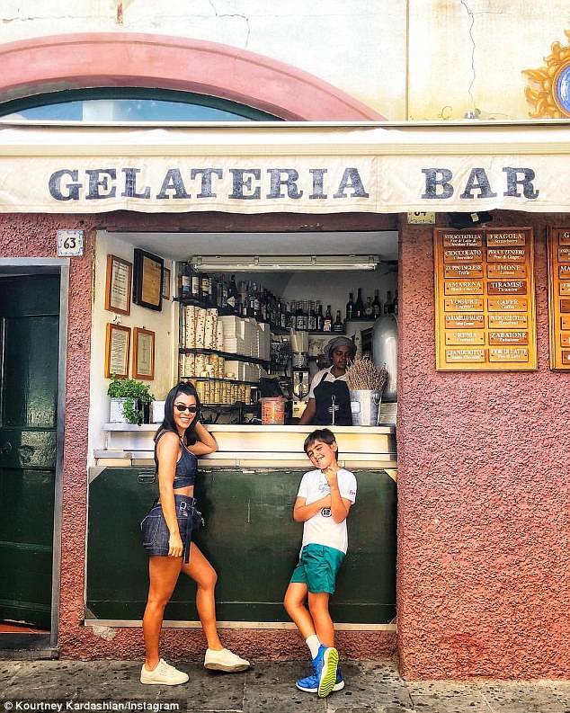 وبدا أن "كورتني" التي تبلغ الـ39 عامًا من عمرها تسترجع ذكريات رحلتها العائلته الميدانية، إذ نشرت صورة أخرى لها بجوار ابنها ميسون البالغ من العمر ثمانية أعوام أمام واجهة مطعم "Gelateria Bar" ينتظران طبق من الجيلاتو، وتألقت مرتديةً زي دنيم مؤلف من قطعتين شورت قصير وتوب قصير كشف بطنها المسطح، وعلَّقت: "الساعة الخامسة مساءً يوميًا."