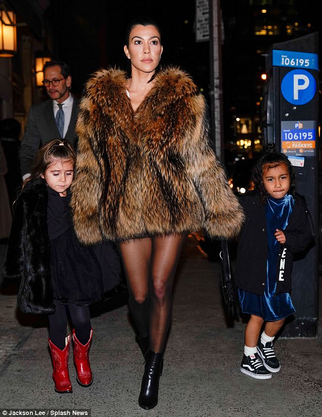 وتألقت "كورتني" بمعطف فراء ضخم بني اللون يصل للفخدين، ونسقت إطلالتها بجوارب سوداء شفافة، وجزمة جلدية سوداء. في حين تألقت ابنتها "بينولوبي" ذات الخمسة أعوام بمعطف فراء أسود اللون أنيق، وأسفله ارتدت فستان أسود مخملي اللون، ونسقت إطلالتها بحذاء برقبة مرتفعة أحمر اللون.