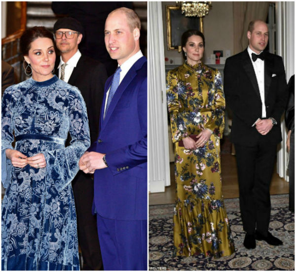 وقبلها أطلت خلال حفل العشاء المقام في مقر السفير البريطاني، ارتدت "كيت" فستانًا محتشمًا باللون الأصفر-الكموني بزخارف وردية من توقيع نفس المصمم وصل سعره نحو 1.945 جنيه إسترليني.