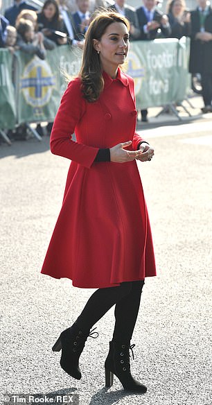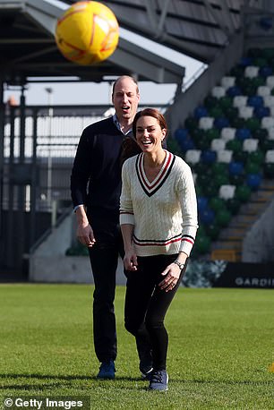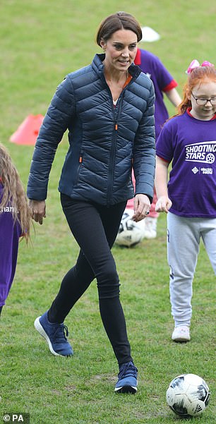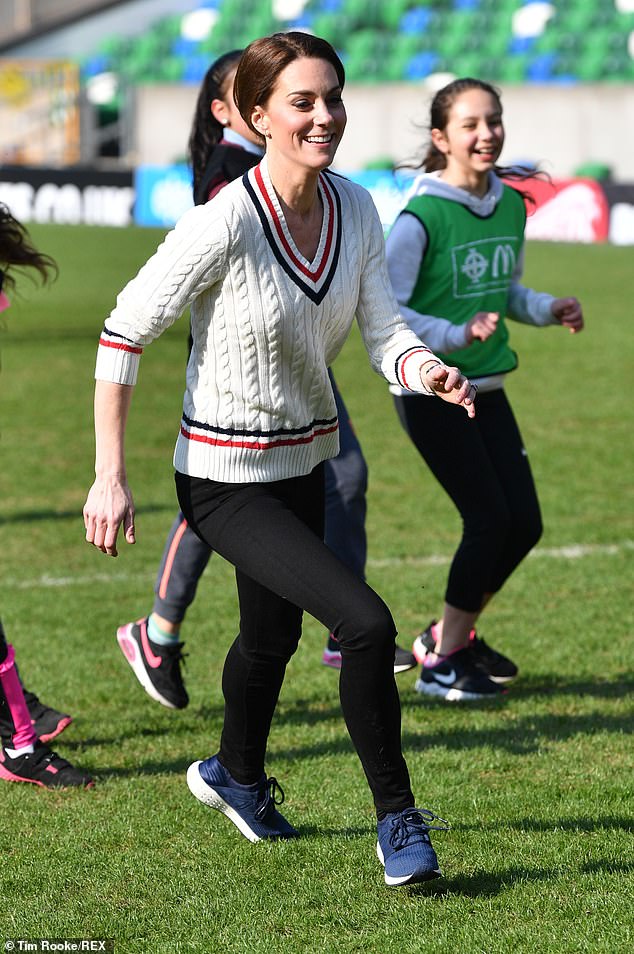 وحال نزولها على أرض الملعب، استعرضت الدوقة مهاراتها الرياضية حينما شاركت التلاميذ بلعب كرة القدم، ثم انضم إليها زوجها فيما بعد، وبدا عليهما الانسجام والحماسة.