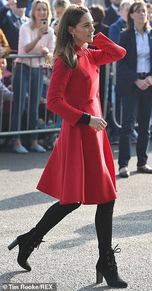 في بداية جولتها، تألَّقت "كيت ميدلتون"، البالغة من العمر 37 عامًا، بإطلالة غاية في الأناقة والرقي مُتألِّقةً بمعطف أحمر من توقيع "كارولينا هيريرا" يبلغ تكلفته 1200 دولار أمريكي، وهو ذاته الذي ارتدته خلال جولتها إلى كندا عام 2016، ونسَّقته بانتعال زوج من أحذية “ليك بينيت”.
