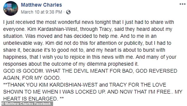 كان "ماثيو تشارلز" من أوائل السجناء الذين تم إطلاق سراحهم بموجب قانون إصلاح العدالة الجنائية الذي دافعت عنه كارداشيان، بل وسددت له أيضاً إيجار السنوات الخمس المقبلة بعدما علمت أن "تشارلز" لا يستطيع العثور على منزل خاص بسبب سجله الجنائي.