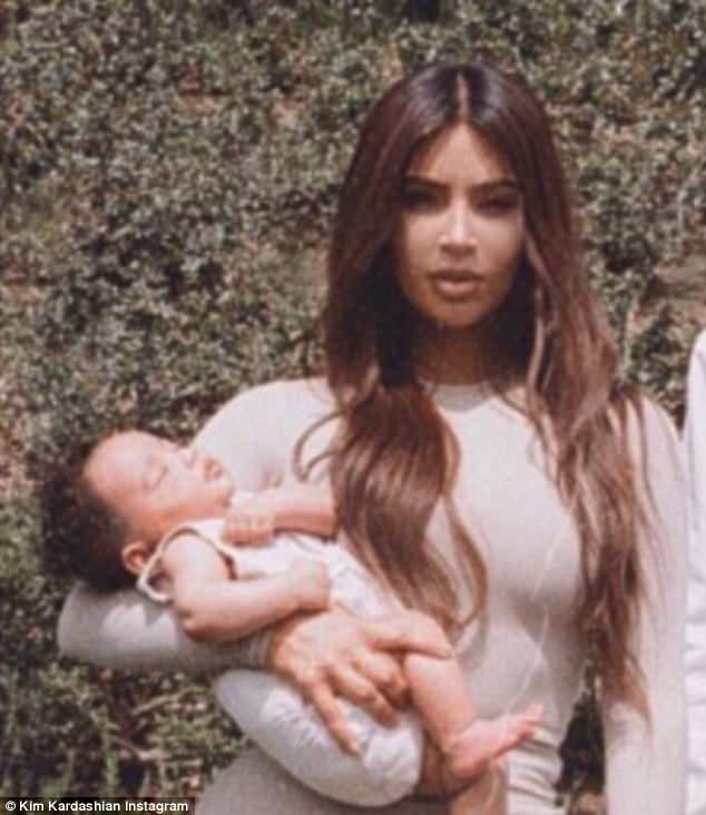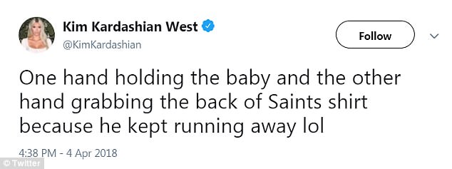 ثم نشرت "كيم" تغريدة عبر حسابها على موقع "تويتر"، توضِّح من خلالها سبب إمساك طفلتها "شيكاغو" بيدٍ واحدة، وكتبت: "في إحدى يدي أحمل طفلتي، وفي اليد الأخرى أمسك قميص "سانت" من الخلف لأنه استمر في الركض بعيدًا."