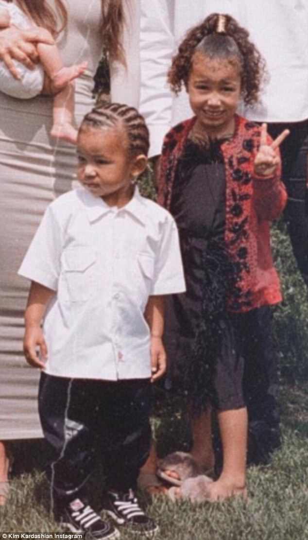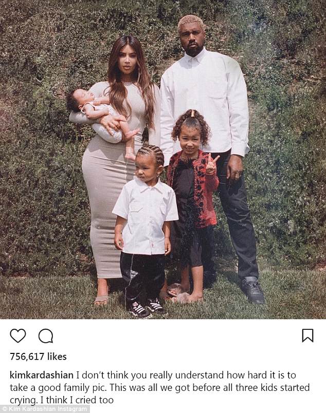 وحملت "كيم" طفلتها الرضيعة النائمة "شيكاغو" بين يديها، بينما وقف زوجها "كانييه" بشعره الأشقر مرتديًا قميص أبيض إلى جانبها، ووقف طفليها؛ "نورث (4 أعوام) التي رفعت إشارة السلام بأصابعها وسانت الذي يبلغ عامين أمامهما.