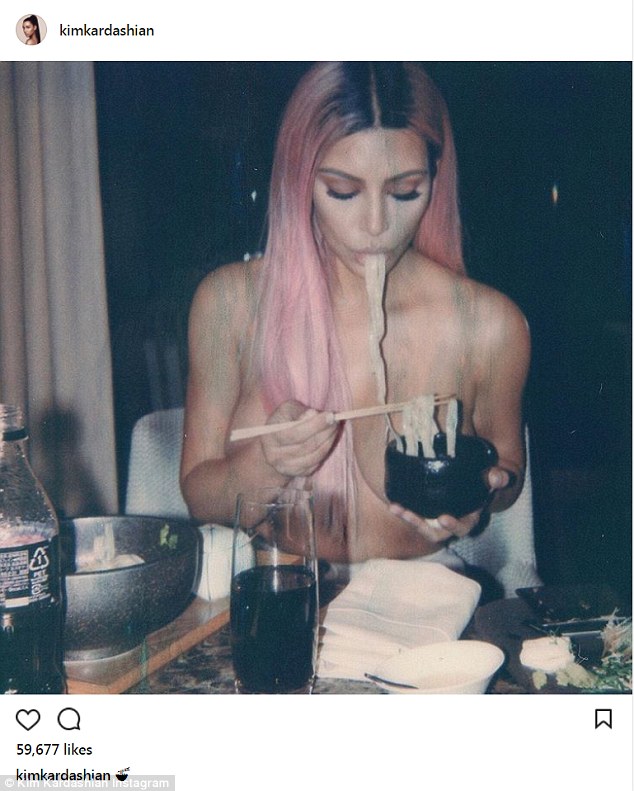 نشرت "كيم كاردشيان"، البالغة من العمر 37 عامًا، صورة مثيرة لها وهي تتناول "النودلز"، في حين تعرت وأسدلت شعرها الوردي على جانب كتفها، وغطَّت صدرها بكلتا يديها.