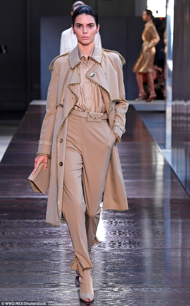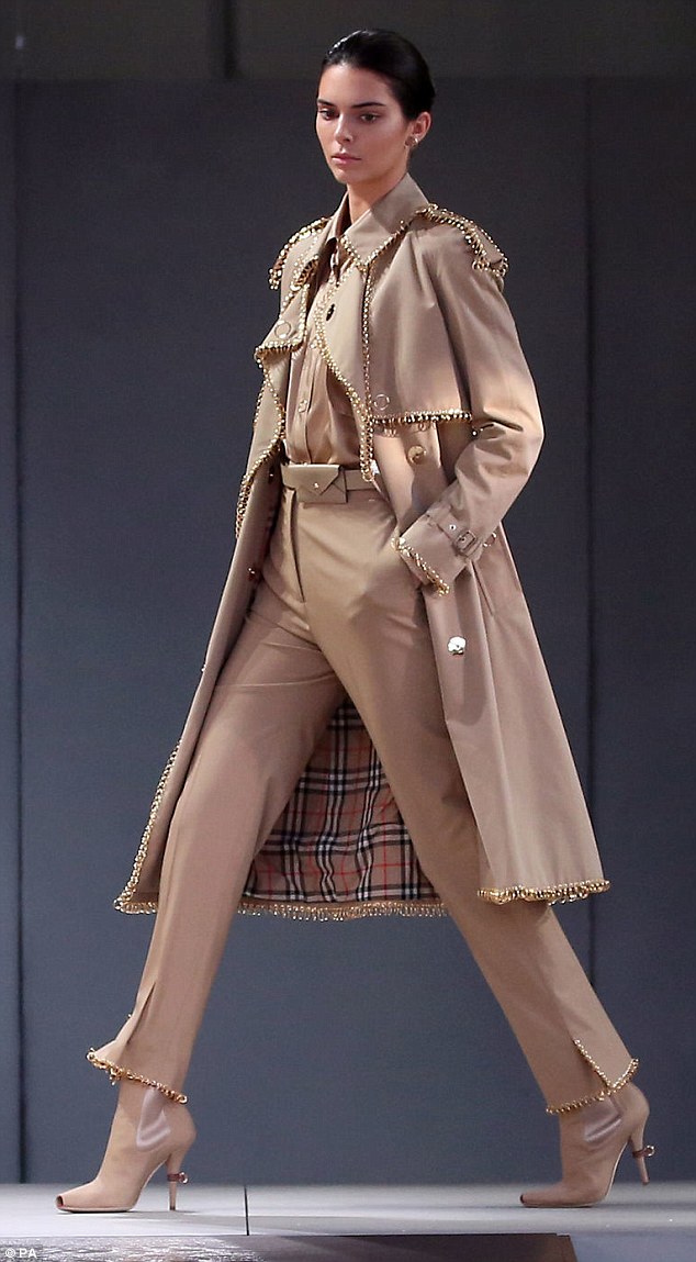 تألّقت فتاة كارداشيان-جينر بإطلالة مُحتشمة للغاية، تألّفت من 3 قطع مُتطابقة اللون، وهي بنطال بقصة الجزرة، ومعطف الترنش الأيقوني، وقميصاً فضفاضاً، وتميّزت إطلالة جينر بالجديدة والمُتطوّرة، وذلك لأنّه أضافت علامة بيربري إلى تصميماتها الكلاسيكية لمستها عصرية، تألّفت من سلاسل ذهبية اللون حفّت أطراف المعطف والبنطال، فضلاً عن اعتماد حلقات السلاسل أزرارً للقميص.