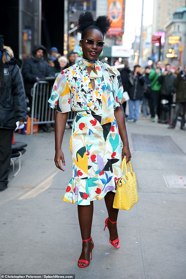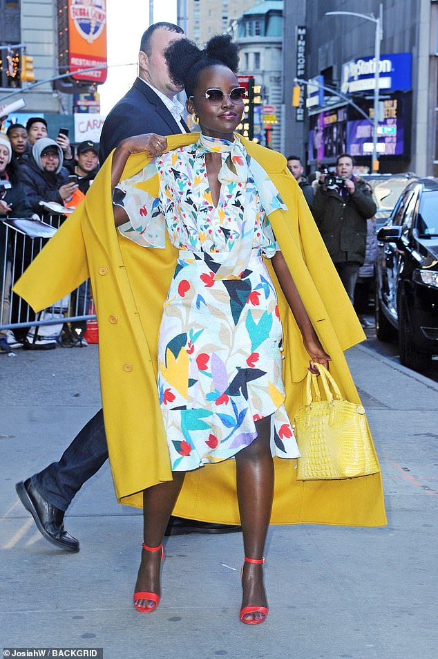 واختارت "لوبيتا" إطلالة صفراء مُشعة خلال توجهها لبرنامج Good Morning America يوم الثلاثاء الماضي، فتألَّقت مُرتديةً طقمًا أبيض مؤلفًا من تنورة وتوب مُزيَّن بطبعات عشوائية ملونة من توقيع العلامة التجارية "Parbal Gurung" بقيمة 1,122 جنيه استرليني، ونسَّقت إطلالتها بمعطف فضفاض طويل أصفر اللون.