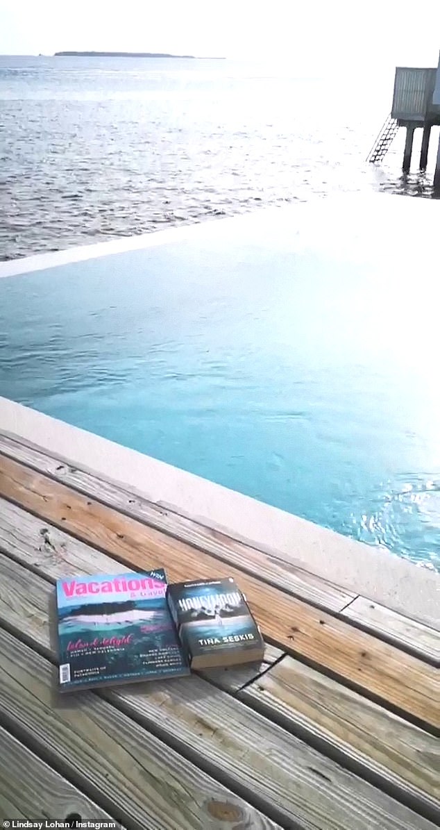 كما استمتعت النجمة بأشعة الشمس مُرتديةً ملابس سباحة سوداء كاشفة، كما لجأت إلى الكتب لتحظى بالقليل من المعلومات حول المنطقة التي تتواجد بها.