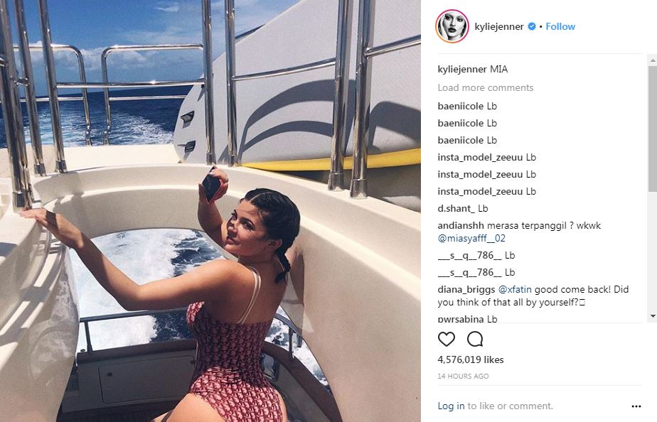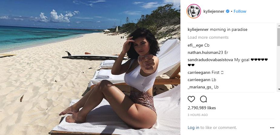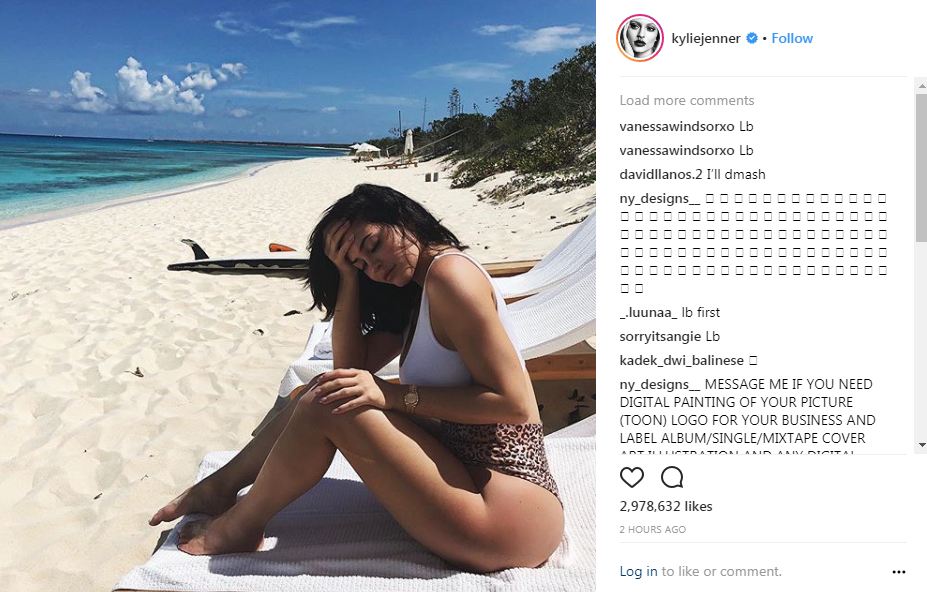 جاء رداء السّباحة هذا بعد ارتداء كايلي مايوه بتوقيع علامة "كريستيان ديور"، تألّف من قطعةٍ واحدة باللونين الأبيض والأحمر، في حين ارتدى حبيبها المُغنّي شورت السباحة الخمري.