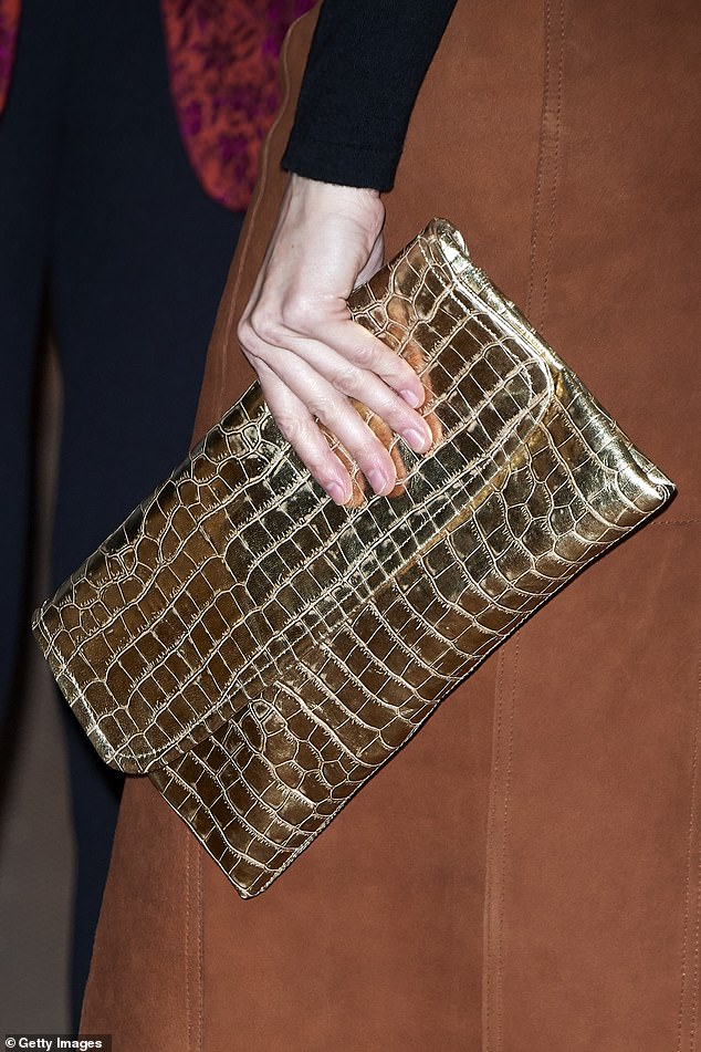 ورغم الإحراج الذي تعرضت له، إلّا أنها بدت جميلة بتسريحة شعرها المموجة المُنسدلة على جانبي كتفها، ومكياجها البسط مُعتمدةً مكياج عيون برونزي وأحمر شفاه نود لمَّاع، كما أكملت إطلالتها بكلاتش ذهبي من جلد التمساح.