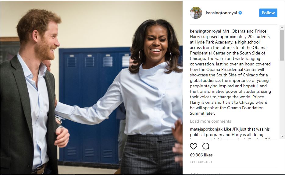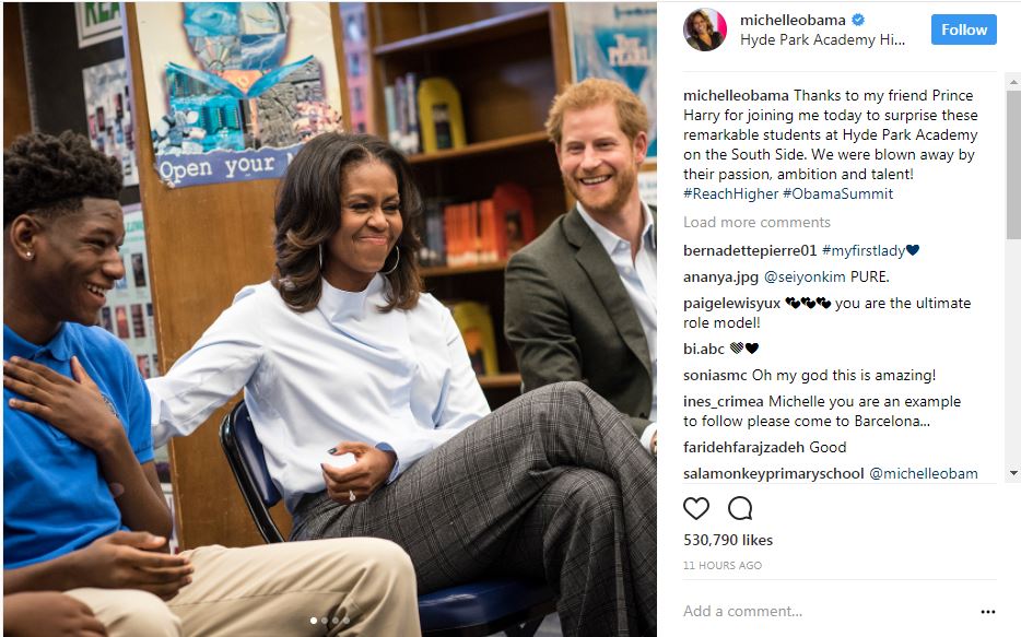 بعدما التقيا الشهر الماضي خلال إنفكتوس للمحاربين القُدامى والذي أُقيم في مدينة تورنتو الكندية، قام كل من الأمير هاري وسيدة أمريكا السابقة "ميشيل اوباما" بزيارة طُلّاب أكاديمية هايد بارك في مدينة شيكاغو والالتقاء بهم من خلال جلسة حوارية للتعرف على شغف وطموح الشباب وذلك قبل مؤتمر مؤسسة أوباما حسبما نقل موقع "انترتيمنت تونايت".