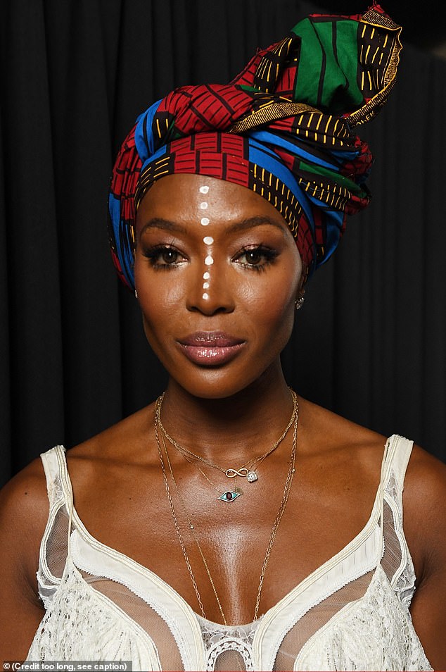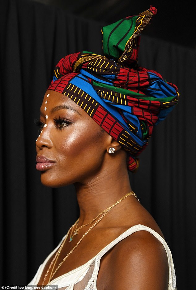أطلت "كامبل"، البالغة من العمر 48 عامًا، مرتديةً فستان أبيض من قماش الدانتيل الشفاف ذو قصة أنيقة أبرزت خصرها النحيل وقامتها الممشوقة، ولإبراز الجانب الإفريقي ارتدت وشاح ملوَّن على رأسها عقدته بطريقة معينة، واعتمدت مكياج عيون دخاني وأحمر شفاه نود، ورسمت عدة نقاط بيضاء على جبهتها امتدت إلى أسفل أنفها.