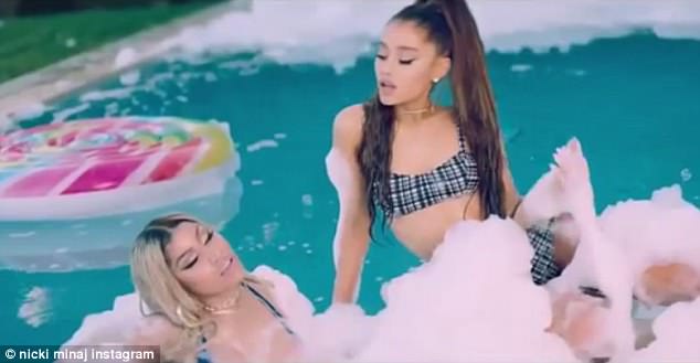 نشرت "نيكي ميناج" البالغة من العمر 35 عامًا مجموعة صور عبر حسابها على موقع "إنستغرام" تمثل مقتطفان من الفيديو المصور لأغنيتها الجديدة بعنوان "BED" بالتعاون مع المغنية الأمريكية الشابة "أريانا غراندي، مبرزةً منحنيات جسدها المثير بوضعيات فاضحة وملابس شفافة داخل بركة سباحة يوم الثلاثاء الماضي.