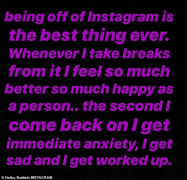 فعبر خاصّية "القصص" في تطبيق إنستغرام، بدأت زوجة النّجم العالمي "جاستين بيبر" رسالتها بـ "الابتعاد عن إنستغرام هو أفضل شيءٍ على الإطلاق، وفي كُل مرّة آخذ استراحةً منه، أشعر بأنني أفضل بكثير وأسعد من ذي قبل، ولكن في الدّقيقة التي أعود فيها لاستخدام التطبيق، يُخيّم علي الشعور بالقلق والحُزن".