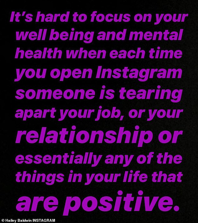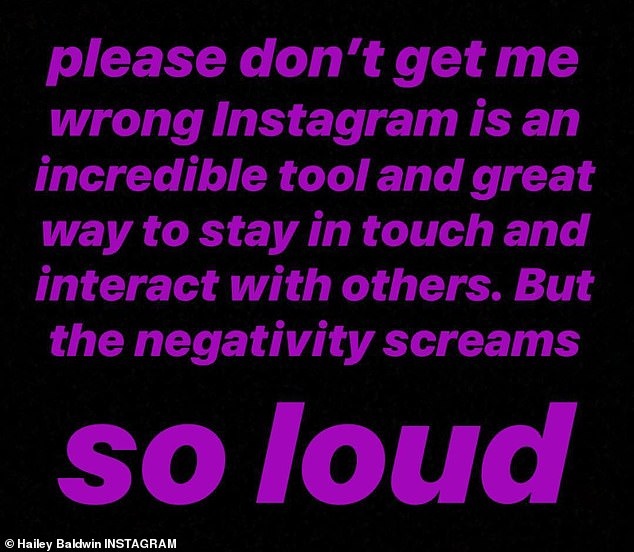 اسطردت هايلي كلامها قائلةً: "لا تفهموني خطأ، فإنستغرام عبارة عن تطبيق رائع وأداة تواصل مُمتازة، لكنّ السلبية الموجودة فيه أصبحت وكأنها تصرخ من شدّتها، فمن الصّعب أن تُركّز على صحّتك النّفسية والعقلية في كُل مرّة تفتح فيها التّطبيق، لتجد شخصًا ما يُدمّر عملك أو علاقتك أو أي شيءٍ إيجابي في حياتك".