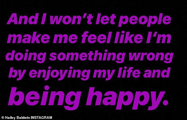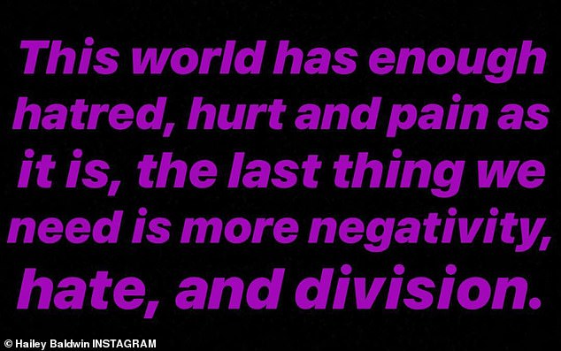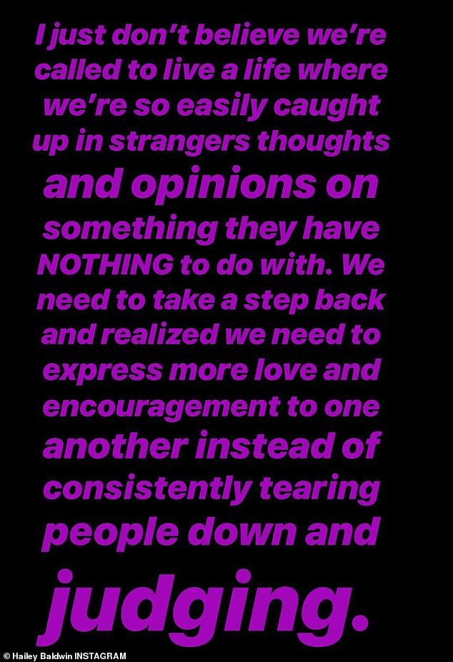 وتابعت هايلي مُعاناتها مع سلبية الغُرباء على السوشال ميديا قائلةً: "لا أستطيع أن أصدّق بأننا خُلقنا في مكانٍ يستطيع فيه الغُرباء أن يقولوا آراءهم وأفكراهم بكُل سُهولة في أشياءٍ لا تعنيهم على الإطلاق. لذا من الضّروري أن نرجع خُطوةً إلى الوراء ونستوعب بأننا يجب أن نُشجّع ونُحب بعضنا البعض، بدلًا من انتقاد وتدمير بعضنا".