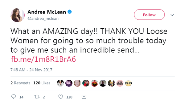وبعد انتهاء الحلقة، عبّرت "أندريا" عن سعادتها بهذه المفاجئة بتغريدة نشرتها عبر حسابها الرسمي على تطبيق "تويتر": "يا له من يوم رائع، شكرًا فريق Loose Women".