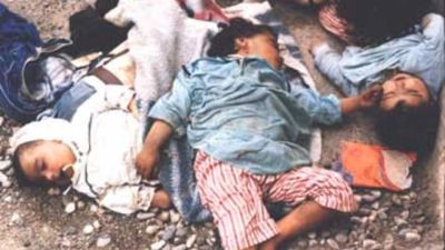 "وفي الصباح الحزين، كانت آثار المعاهدة واضحة جلية، الطفل على صدر أمه مذبوحاً وهي مقطعة ألأوصال، طفل آخر خرج من بيته أمه دون حياة، وأكوام من الجثث واللحم المتناثر هنا وهناك وبرك الدماء. البطون بقرت، والعيون افقئت، والأرجل والايدي قيدت وقطعت والاعراض هتكت".