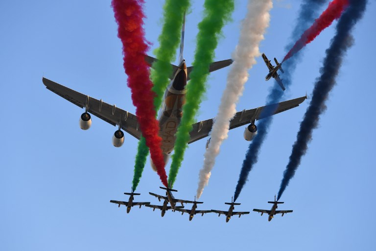 عرض هوائي لطائرات سرب "الفرسان" الإماراتي قبل بدء سباق جائزة أبو ظبي الكبرى لسيارات فورميولا ون أمس الأحد والذي فاز فيه السائق الفنلندي بوتاس.