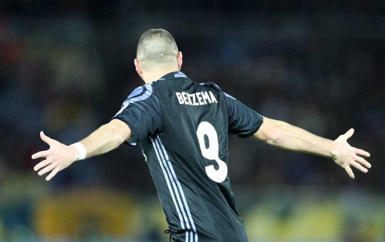 كريم بنزيمة مهاجم ريال مدريد يحتفل بهدفه في شباك كلوب أميركا خلال لقاء نصف نهائي كأس العالم للأندية الذي انتهى بفوز الفريق الإسباني بهدفين دون رد ليصل النهائي الذي سيواجه فيها غريمه كاشيما آنتلرز الأحد القادم.