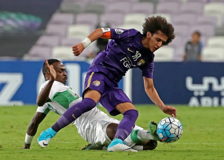صراع على الكرة بين عمر عبد الرحمن نجم العين الإماراتي ومعتز هوساوي لاعب الأهلي السعودي خلال لقاء الفريقين ضمن الجولة الرابعة من منافسات المجموعة الثالثة من دوري أبطال آسيا.