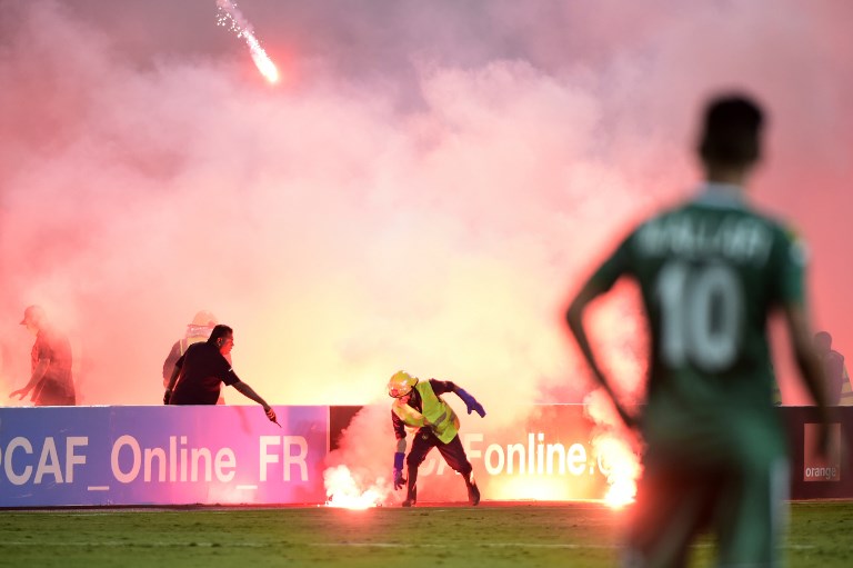 رجل أمن يعمل على إطفاء أحد المقذوفات خلال مباراة الزمالك المصري وأهلي طرابلس الليبي على ملعب برج العرب في الاسكندرية ضمن دوري أبطال إفريقيا.