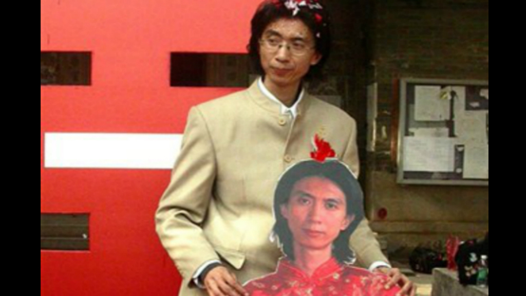 رجل صينى يقوم بالزواج من نفسه ، حيث احضر نموذجًا لشكله مرتديًا ملابس العروس