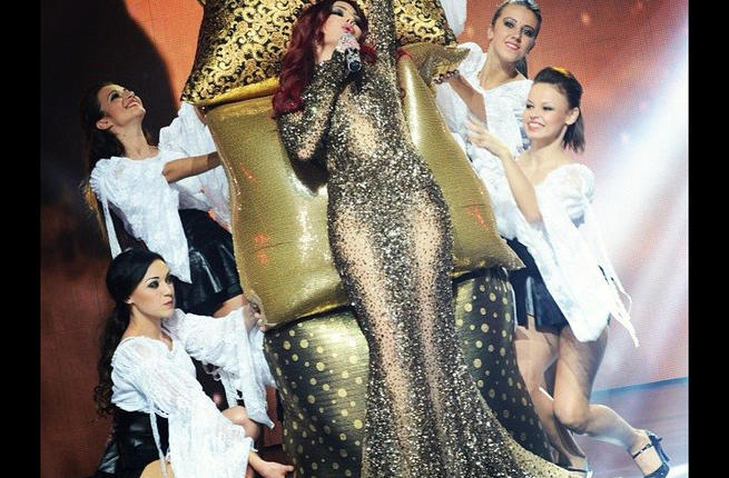 الحسناء اللبنانية أسرت جمهور "آراب آيدول" عام 2013 بفستان ذهبي يبرز جمال قوامها المتناسق، ويزيدها بريقاً على المسرح الذي استضاف عدداً من جميلات عالم الاستعراض في الوطن العربي.