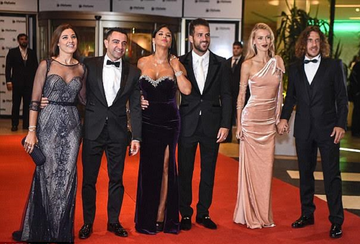 لاعبي برشلونة السابقين تشافي هرنانديز، سيسك فابريغاس وكارليس بويول وزوجاتهم عند وصولهم للسجادة الحمراء