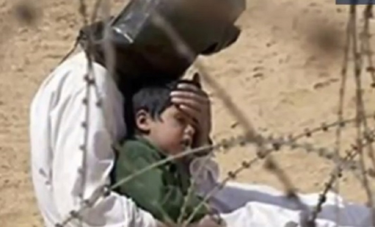 صورة المسجون العراقي الذي حاول حماية طفلة 4 سنوات من حرارة الشمس الحارقة بعدما فك سجانوه قيوده، ولكنهم منعوه من رؤية طفله ووضعوا على رأسه الغطاء .