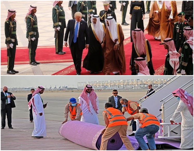 (السجاد الرسمي) دونالد ترامب: حطت طائرته أمام السجاد الأحمر الذي كان معتمدًا في استقبال ضيوف الدولة الرسميين من رؤساء ووزراء وسفراء، ومُمثلي الدول الشقيقة والصديقة. جو بايدن: حطت طائرته أمام السجاد البنفسجي الذي اعتمدته السعودية في عام 2021 الذي يعكس ترحيبَ أرض السعودية بعابريها، وكرمها الذي يتماثل مع كرم أهلها.