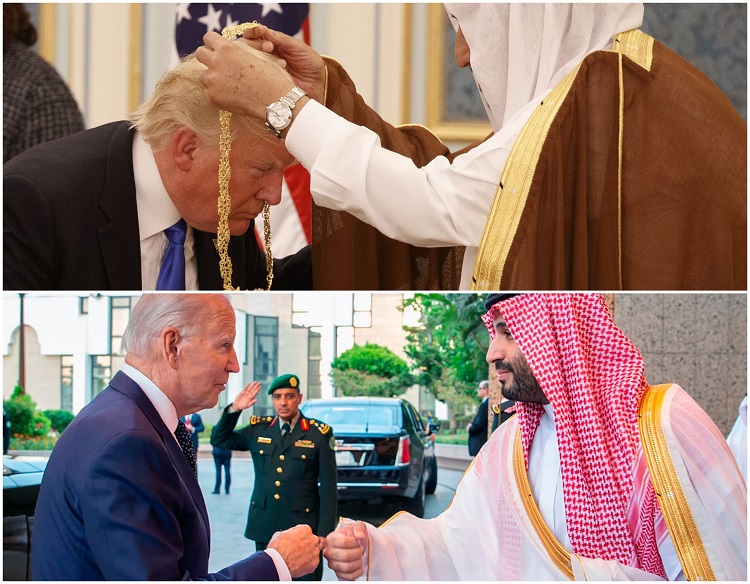 (حرس الشرف الملكي) دونالد ترامب: سار الملك سلمان بن عبدالعزيز معه بين صفين من حرس الشرف السعودي، ثم توقفا لبضع دقائق في صالة كبار الشخصيات. جو بايدن: لم يمشِ بين فرق الحرس الشرف الملكي وتوجه فورًا نحو المركبة التي نقلته إلى قصر السلام.