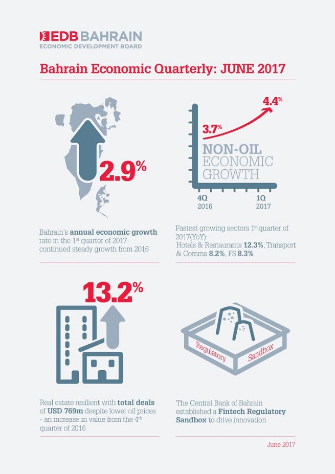 Growth in the non-oil sector of Bahrain’s economy reached 4.4% in the first quarter of 2017, up from 3.7% in 2016, according to the Bahrain Economic Quarterly published by the Bahrain Economic Development Board (EDB).