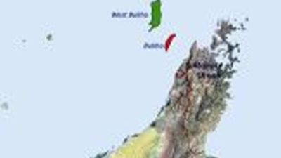 Initial flow rates are 10,000 barrels of 42 degree API gravity oil and 30 million cubic feet per day of associated gas from two wells produced through a recently installed six-slot unmanned platform located in 90 metres of water some 25 kilometers from the Musandam Peninsula.
