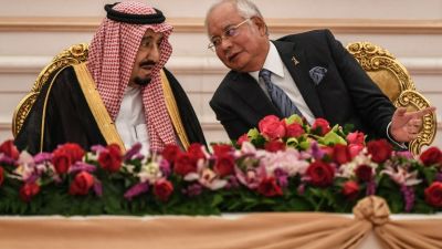 Malaysia's Prime Minister Najib Razak (R) talks with Saudi Arabia's King Sultan Salman bin Abdulaziz al-Saud in Putrajaya, outside Kuala Lumpur.  (AFP/Mohammed Rasfan)