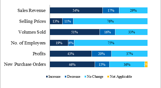 At the sector level, the trade sector appears to be the most confident about their business prospects in terms of revenues, selling prices, profits and new purchase orders. The services sector is the most optimistic about its hiring expectations. Within the trading sector, auto traders are optimistic of higher volumes during Q2 2018 with a net balance of 75% based on higher demand. Exporters are more upbeat than domestic market-oriented firms across all the parameters in the Survey.