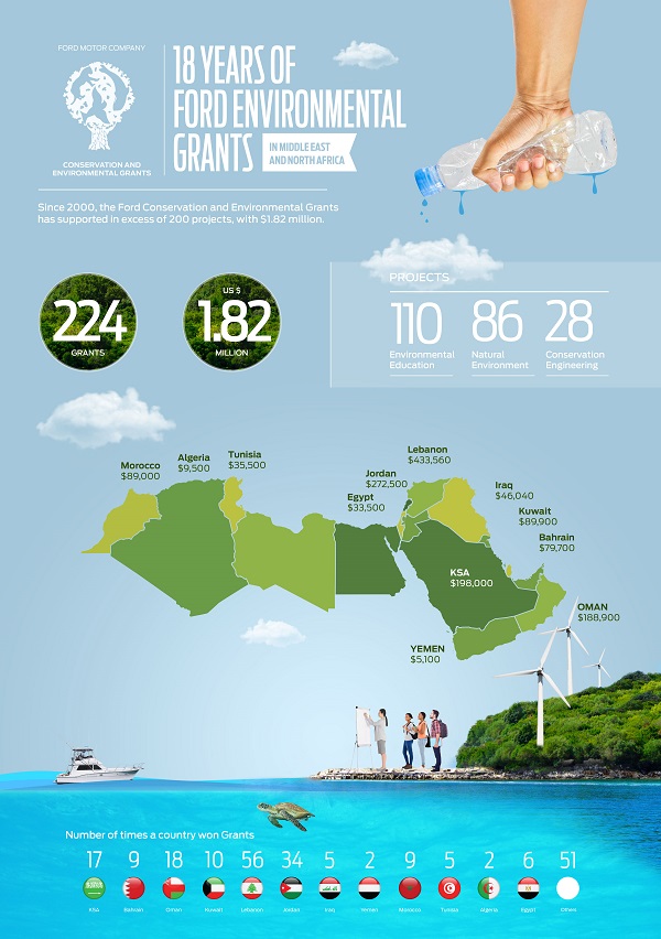 Ford Middle East is also a responsible corporate citizen in the region, with the Ford Motor Company Conservation & Environmental Grants, a grass-root level program that has offered nearly US$1 million in grants to over 120 Middle Eastern environmental projects since 2000.